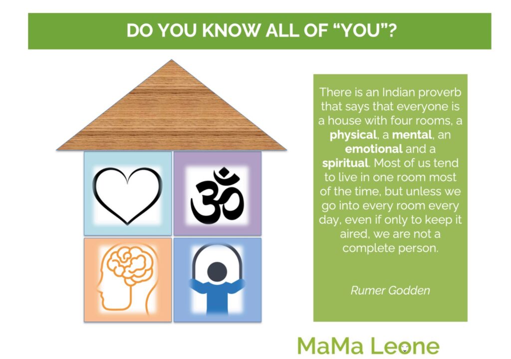 As an Indian proverb puts it: You are a house with four rooms, a physical, a mental, an emotional and a spiritual one. The call is to take care of all four rooms, aligning our heart, soul, body and mind.